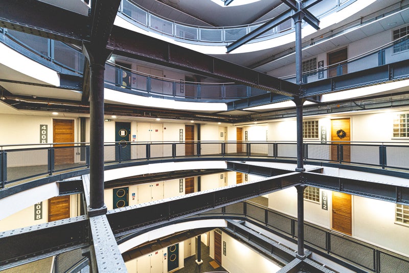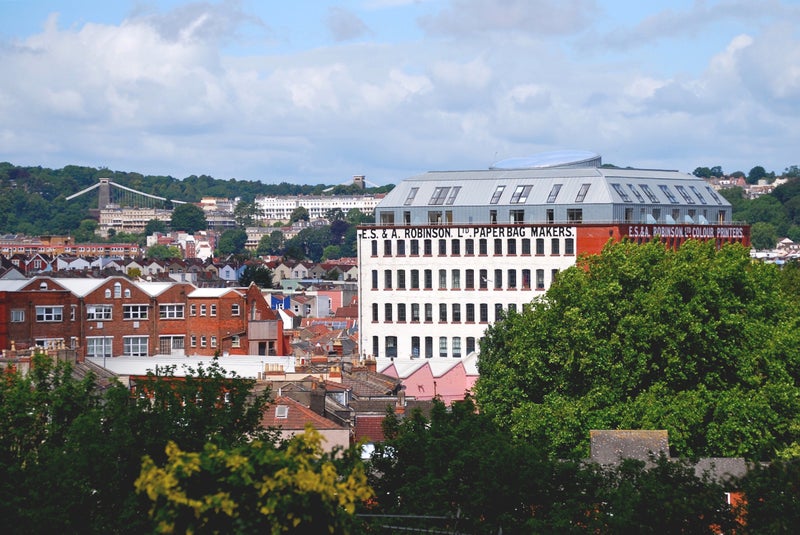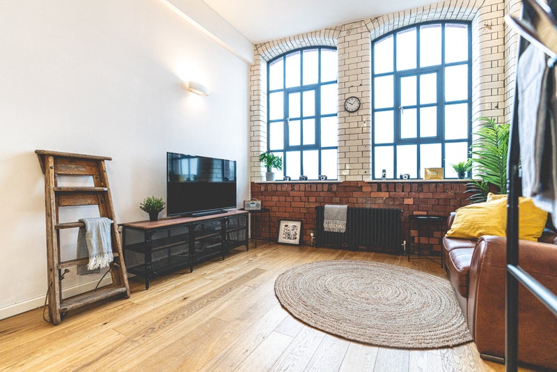 The apartment features a generous open plan living space with high ceilings, red brick walls and large windows overlooking Bristol.