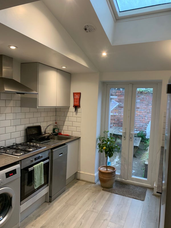 The garden is fitted with fairy lights and a bench for socialising, even on cold nights. The shared kitchen is modern and open plan with living room, with a big tv for evening entertainment!