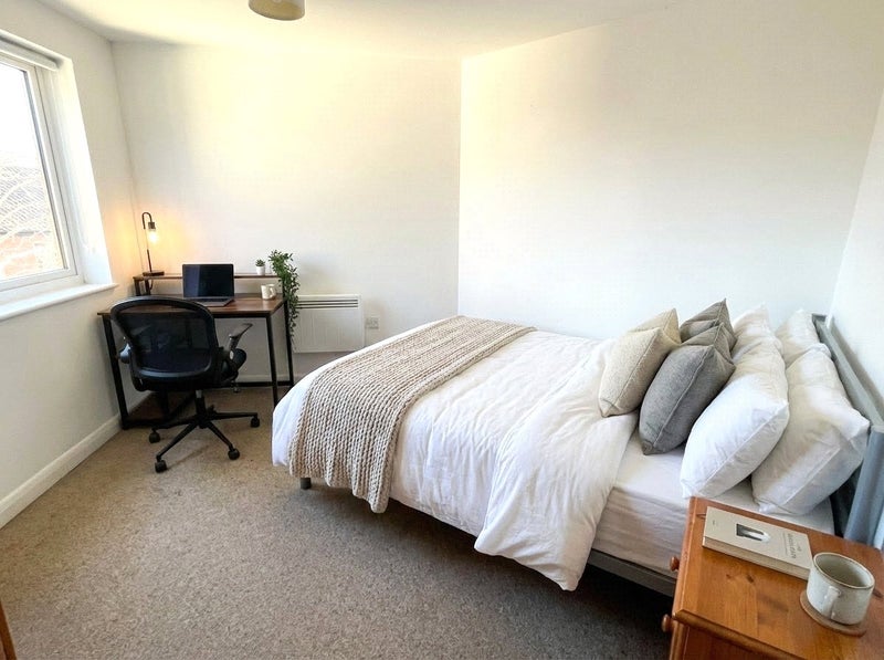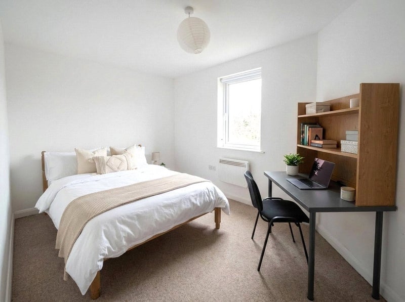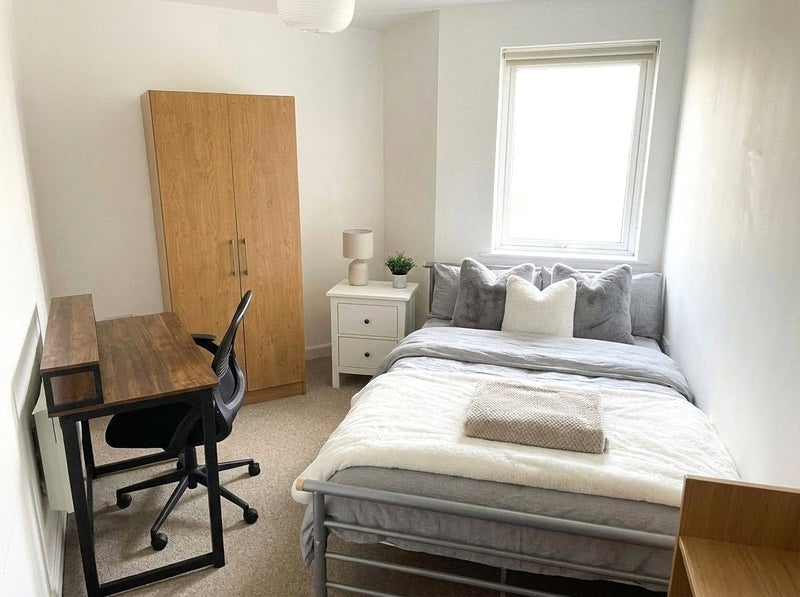 All 6 bedrooms are generous doubles, each furnished with a bed, clothing storage, desk and chair, giving every tenant a COMFORTABLE and practical study space. The open lounge/kitchen area includes a washing machine, oven, BRAND NEW HOB for 2026 and fridge freezer, and the apartment benefits from 2 shower rooms plus a communal bike store.