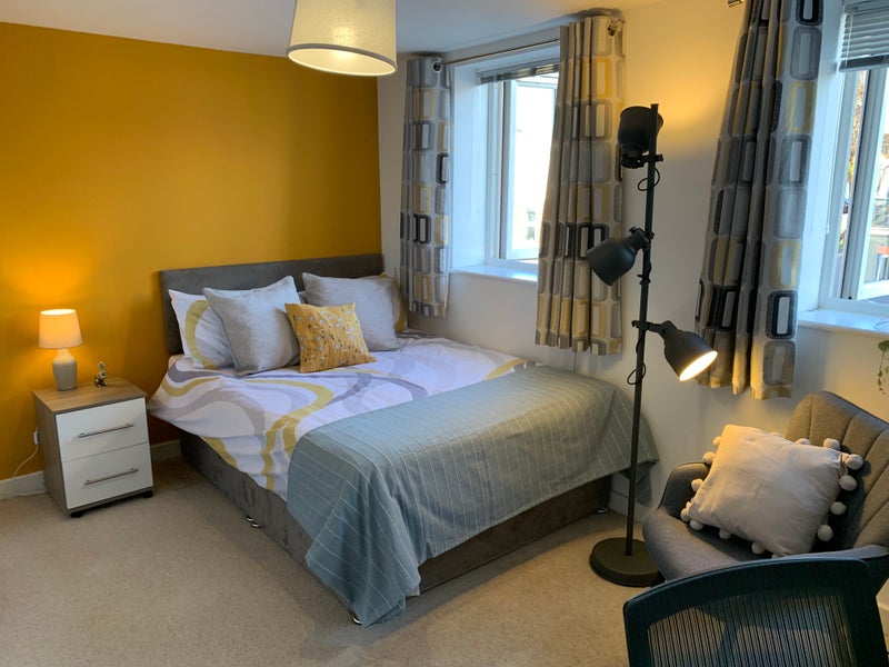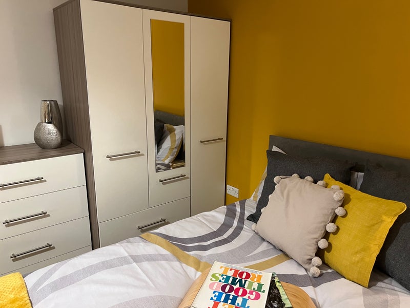 This is a beautifully presented room, fully furnished to be as comfortable as possible: wardrobe, chest of drawers, bedside table with a lamp, with blackout blinds and a double bed (deluxe mattress) for a great night's sleep. Lots of lighting to give you options, and plenty of storage to make sure you’ve got space to relax!