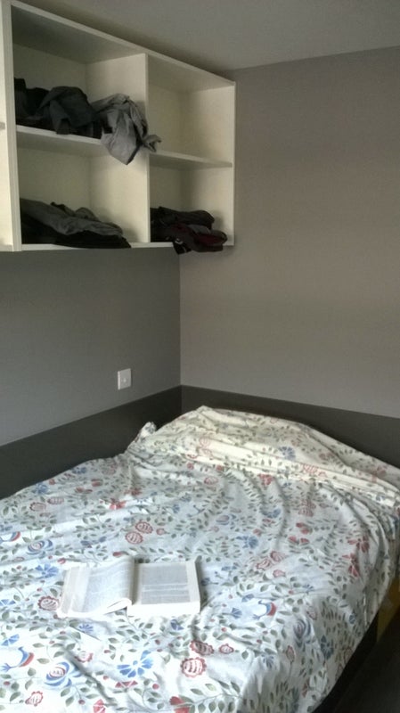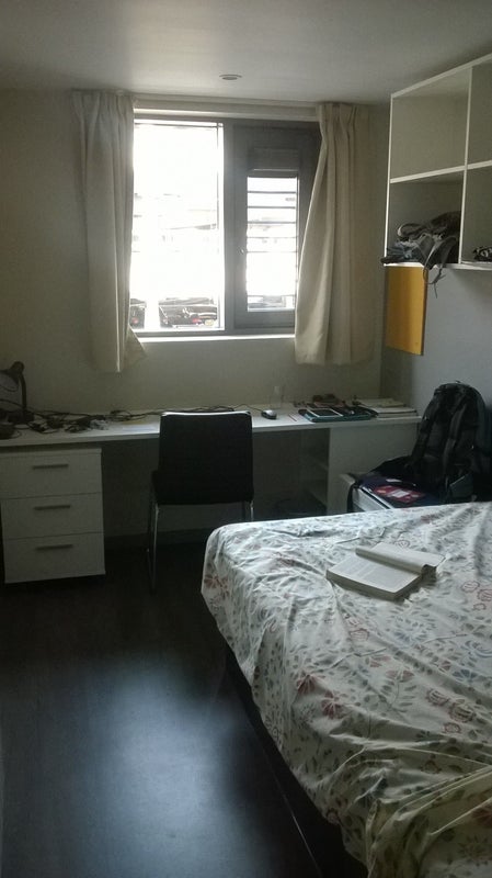 The room is brand new, fair size with double-sized bed, fully furnished with desk, wardrobe and shelves.