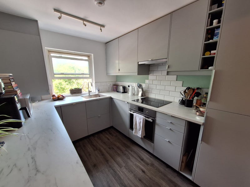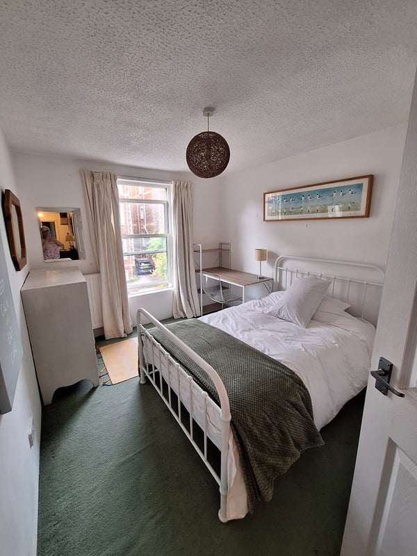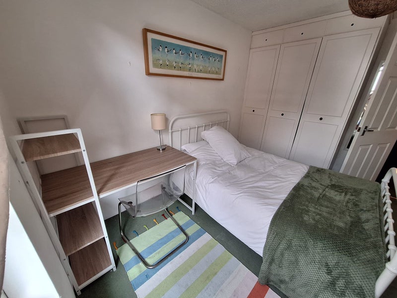 Medium double bedroom, fully furnished, comfy queen size bed, desk, chest of drawers and large fitted wardrobe space. Shared bathroom, modern kitchen and large sitting room.