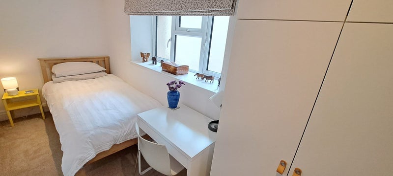 Single room in very comfortable 3 bedroom flat in Oakfield Road, just off Whiteladies Road. 5 mins walk to Bristol University, 4 mins to Clifton Down station. M&S and Everyman cinema round the corner. You will be sharing with two gay guys (not a couple). One of us is here only half-time. The room has a new bed, mattress, wardrobe, desk. The flat is beautifully decorated throughout. It has 2 Bathrooms and separate Laundry Room. We’re looking for someone who wants to share our home so you’re always welcome in the large open plan living room with Nesspresso/Microwave/dishwasher/Apple TV etc. as well as our garden, which includes a garden office which is a great study space. All bills included.