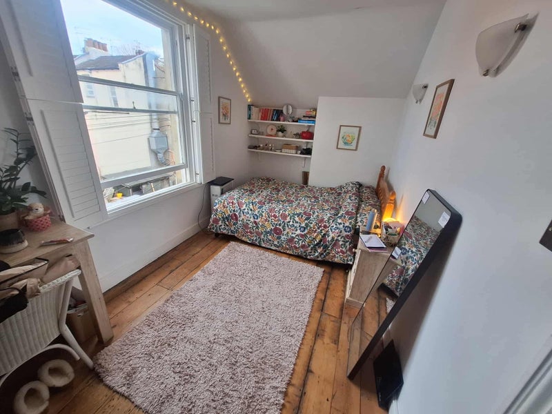 We are looking for someone to replace a housemate that has just left. The bedroom is a decent size room on the third floor of the house, with beautiful bay windows, semi-furnished with a queen size bed, desk, bedside table and clothes rail. There is a bathroom with bath next door and another (spare) bedroom opposite on the third floor.
