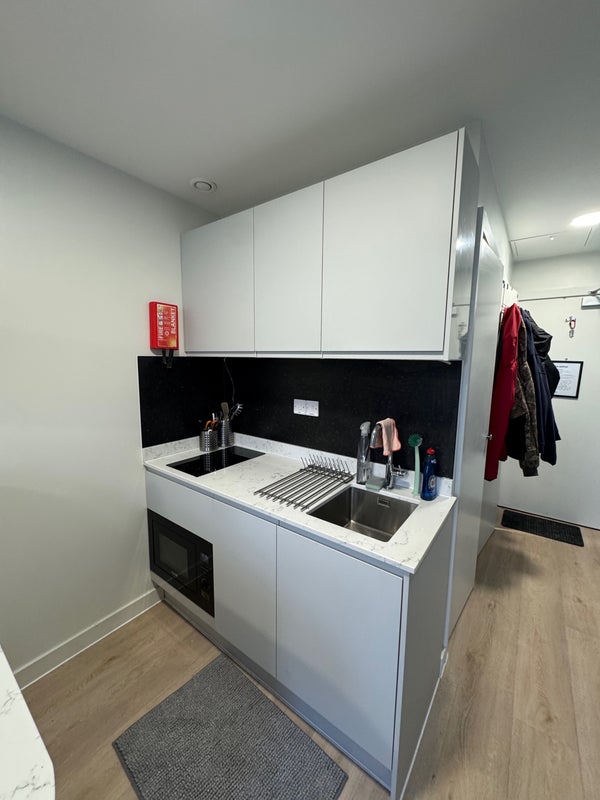 A fully equipped kitchen with an under-counter fridge-freezer, hob, and microwave.