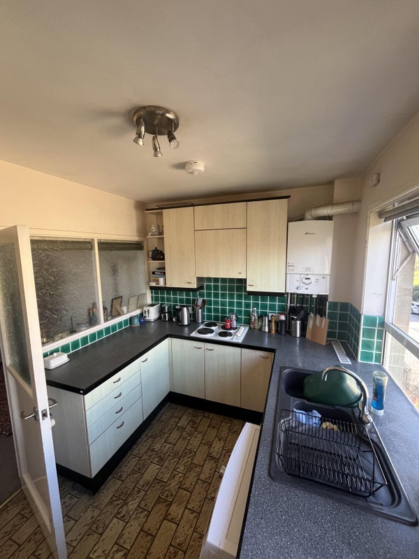 The flat has two bedrooms, spacious living room, kitchen, and a bathroom with an electric shower and bath.