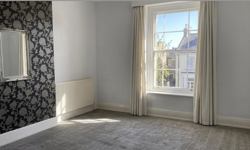The room is very large (about 15ft x 15ft) so plenty of room. It has gorgeous modern double glazed sliding sash window overlooking the massive garden below (sadly not shared). It gets sun pretty much all day making it a lovely large bright room. Build in wardrobe.