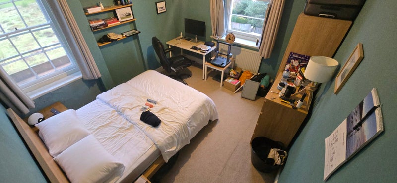 The room comes furnished with a king bed, mattress, wardrobe, desk, chair, chest of drawers, side tables and shelves.