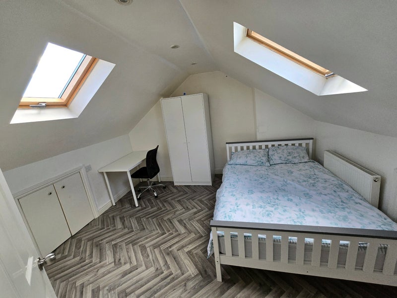 - Furniture provided (oak double bed, duvet set, double wardrobe, desk, desk chair, bedside table)