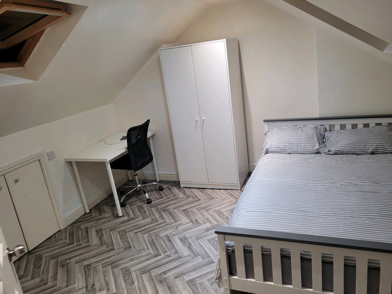 - Furniture provided (oak double bed, complete bedding set including all covers, triple fitted wardrobe, desk, desk chair, bedside table)