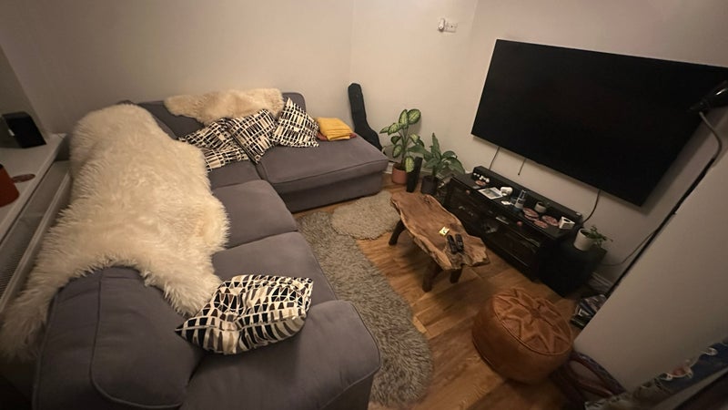 Also downstairs is a medium sized living room with large corner sofa, surround sound system and 65inch screen TV for movie nights.