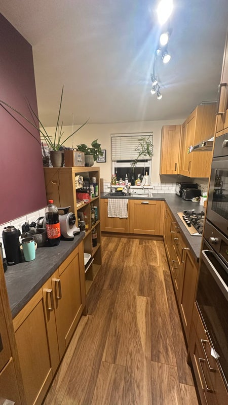 Downstairs is a large open plan kitchen dining room, with gas hobs, dishwasher, large fridge freezer and washing machine.