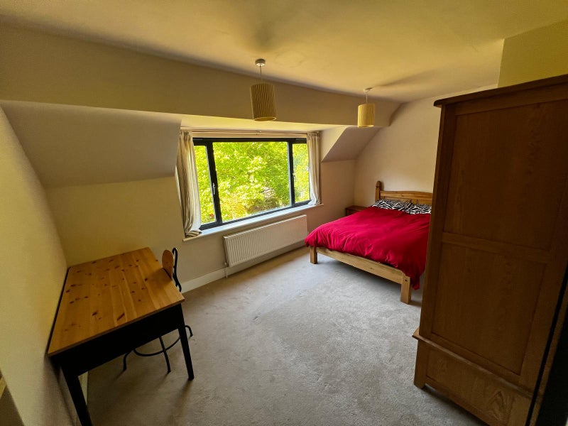 Big bedroom - view into the garden/valley, furnished with double bed with mattress, wardrobe and desk £600/month + bills (£125)