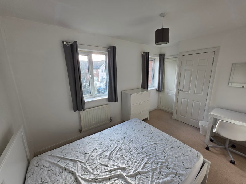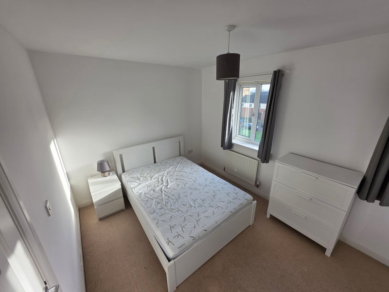 Large Double bedroom with Double bed, Wardrobe, Large 6 drawer chest of drawers, bedside table, table lamp, Mirror, Working electric fireplace, curtains, desk and chair - video tour for reference. More furniture is in the room.