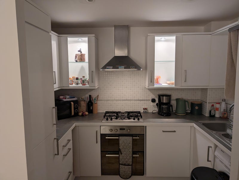- The kitchen has a gas hob, oven, fridge, dishwasher and washing machine.