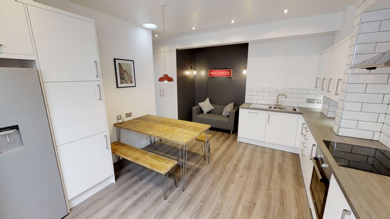 The house has been designed with communal living in mind, featuring a comfortable kitchen and social space with American-style fridge, sofa, dining table and seating, as well as access to a communal garden with outdoor bench seating.