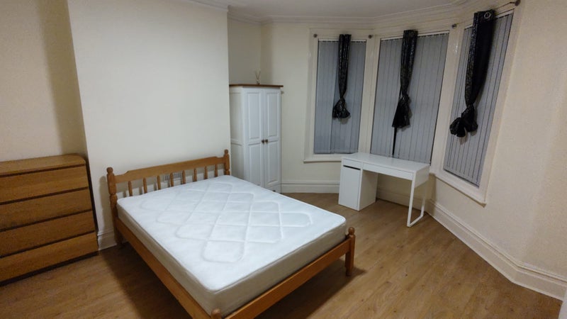 The room come furnished with a desk, wardrobe and a double bed.