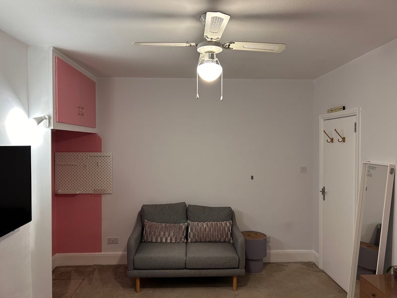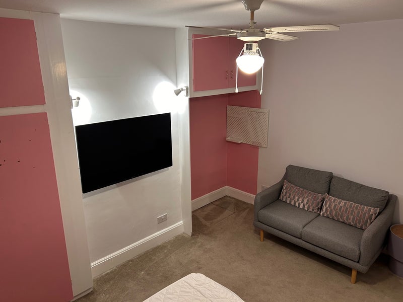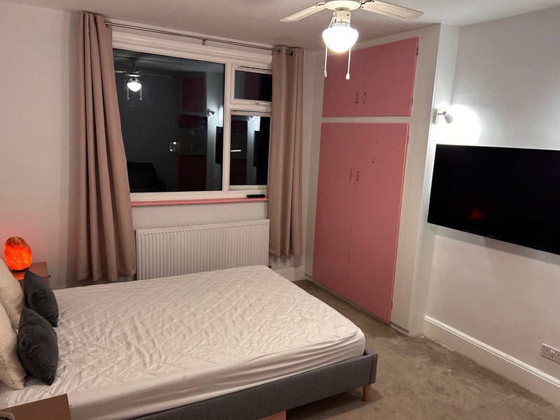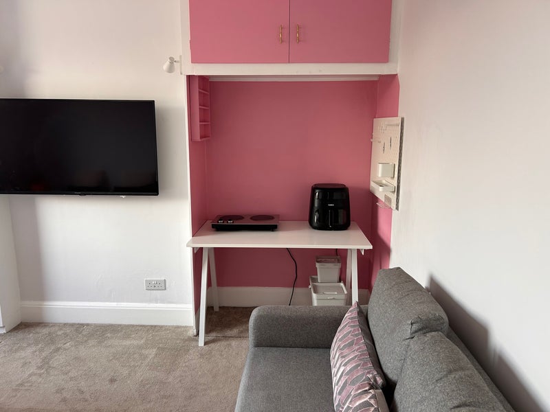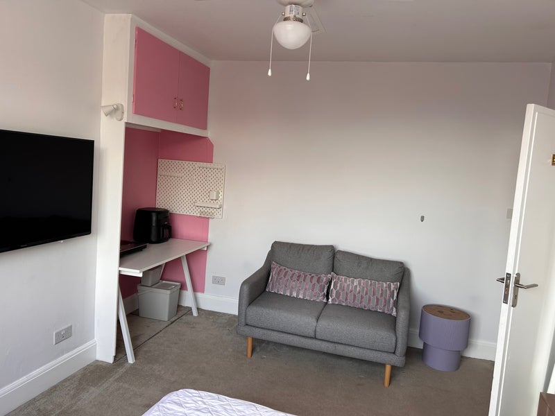 A light, fully furnished , private room with kitchenette. King size bed, smart TV and lots of storage and sofa. This room is located on the back of the house next to the shower room. This is a family home with a professional working single mum, 2 children and 2 cats. There is a garden at the back and the front with plenty of room for relaxing. Space for bike storage and over the road from all the 70 bus routes.