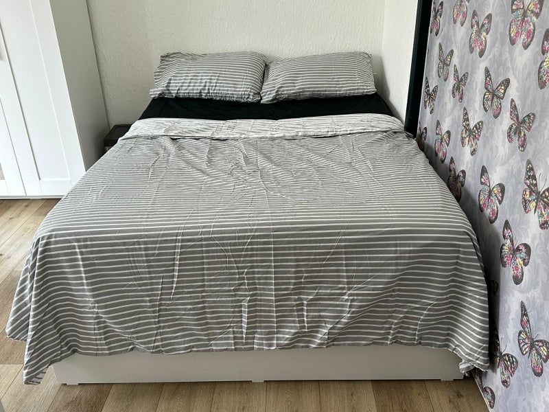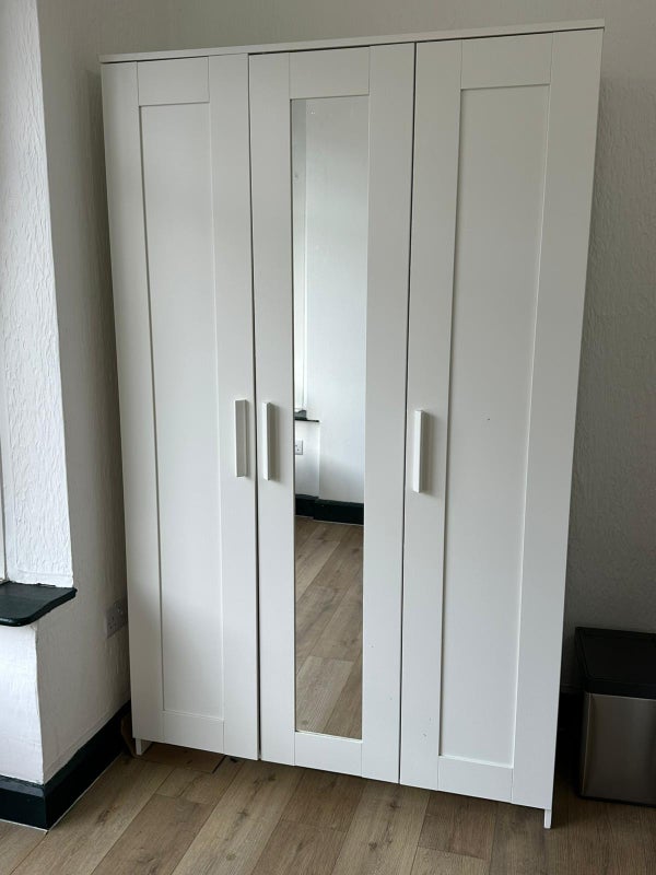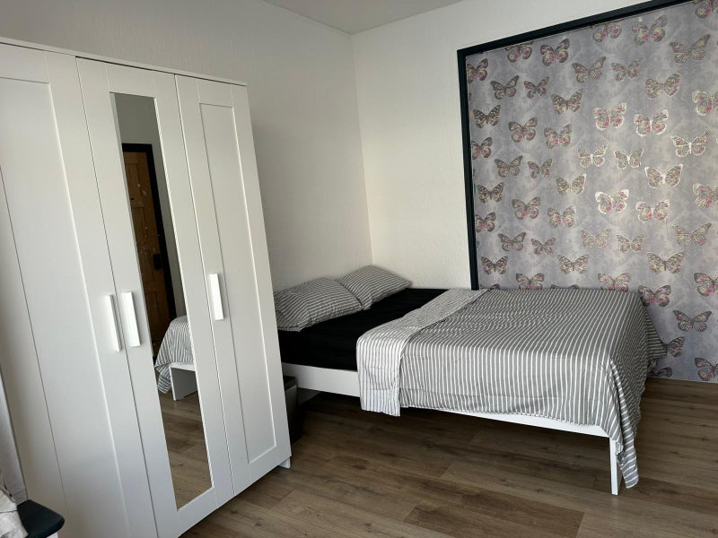 • Fully furnished with bed, mattress, desk, chair, and large three-door wardrobe