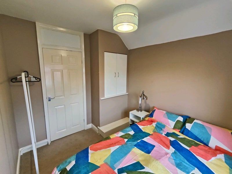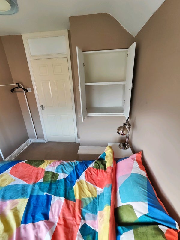 The room is a small double with clothes rail, built in cupboards, bedside table and double bed.
