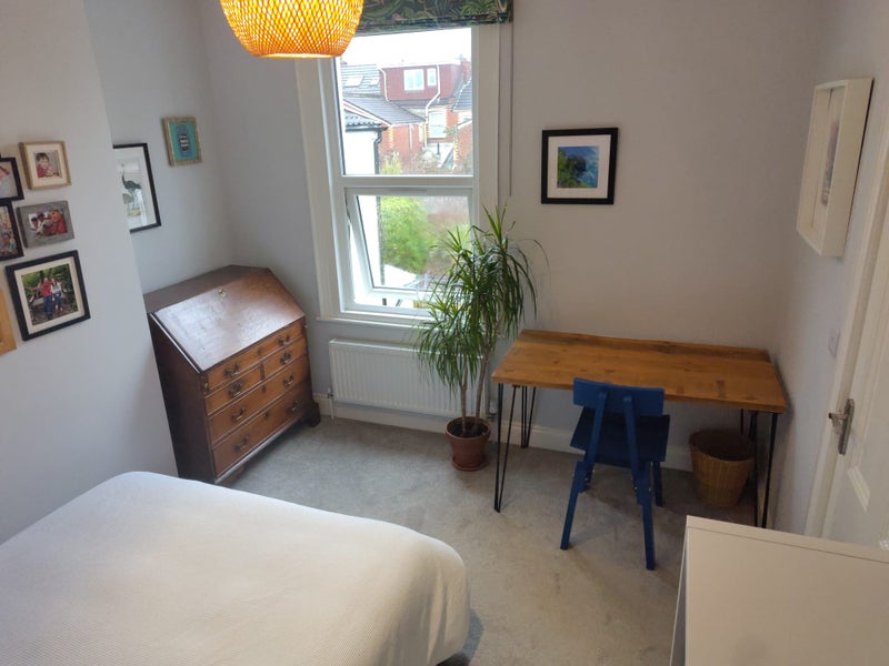 A bright, spacious, and quiet double at the back of the house overlooking the gardens. It's furnished with a double bed and comfy, firm mattress, a set of 4x3 box shelves with storage boxes (new ones being delivered!), a bed side table (and lamp if you want it), a double hanging rail, desk and chair, and an antique bureau desk for extra storage. I have a spare double duvet if you'd like to use it.