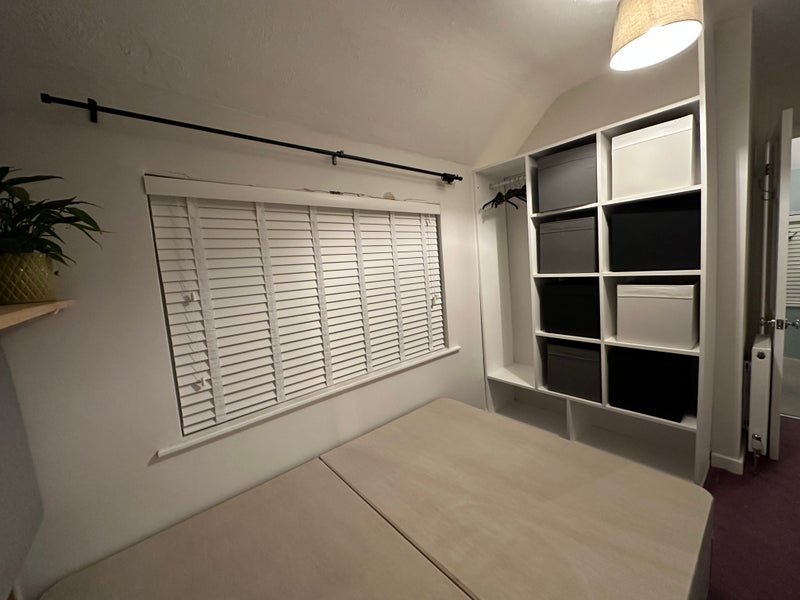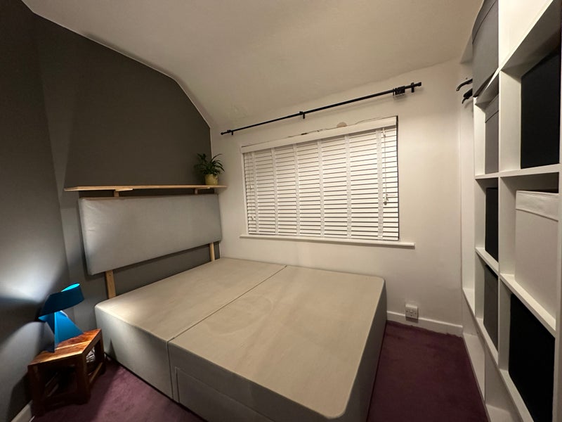 This is a small furnished double, with built in storage. The bed does have a mattress but it was photographed before it was on! The room overlooks the garden and is south facing, so it gets lots of sun right onto the bed when the weather is nice.