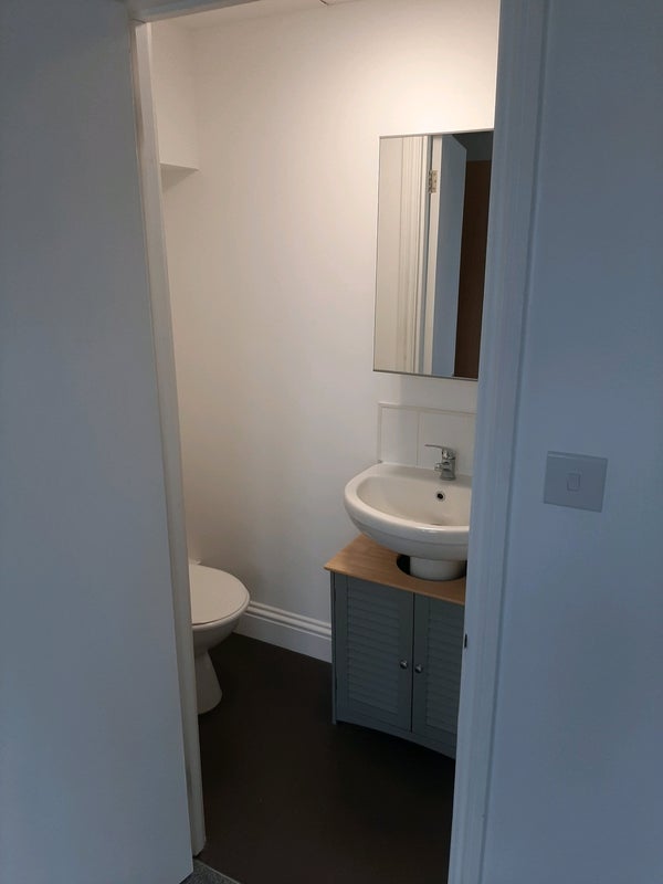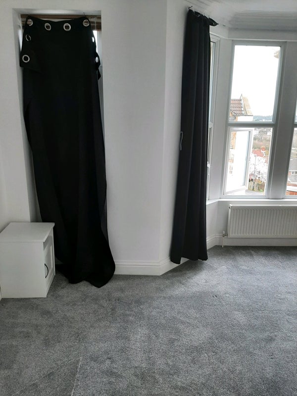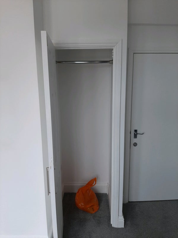 While the room isn't furnished, it does comes with a wardrobe, small bedside unit, under-sink cupboard, and full length black-out curtains.