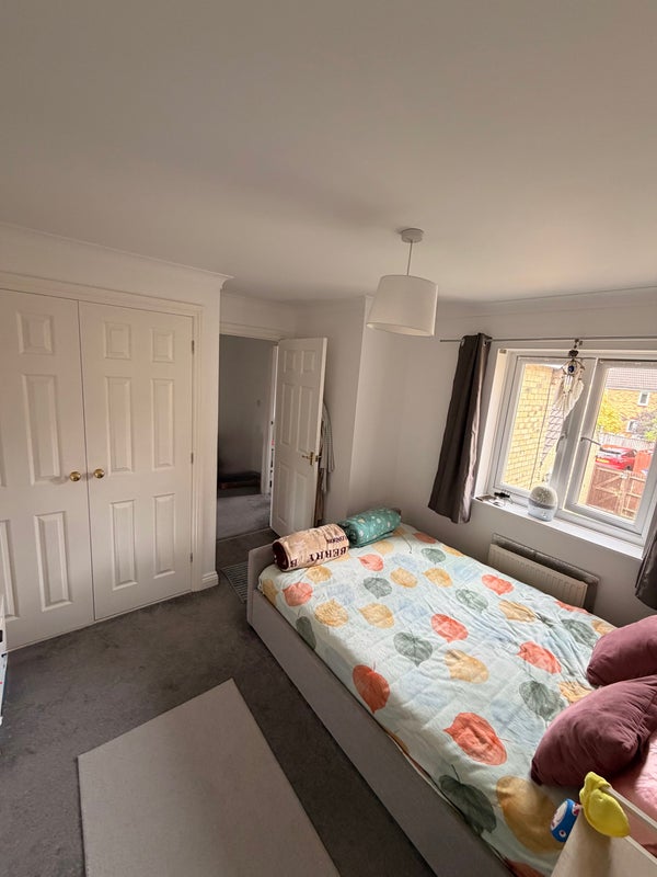 A bright and spacious en-suite bedroom is available in a clean and well-kept family home. The room is fully furnished with a comfortable bed, chest of drawers, and ample storage, built in cupboard, offering both comfort and practicality.