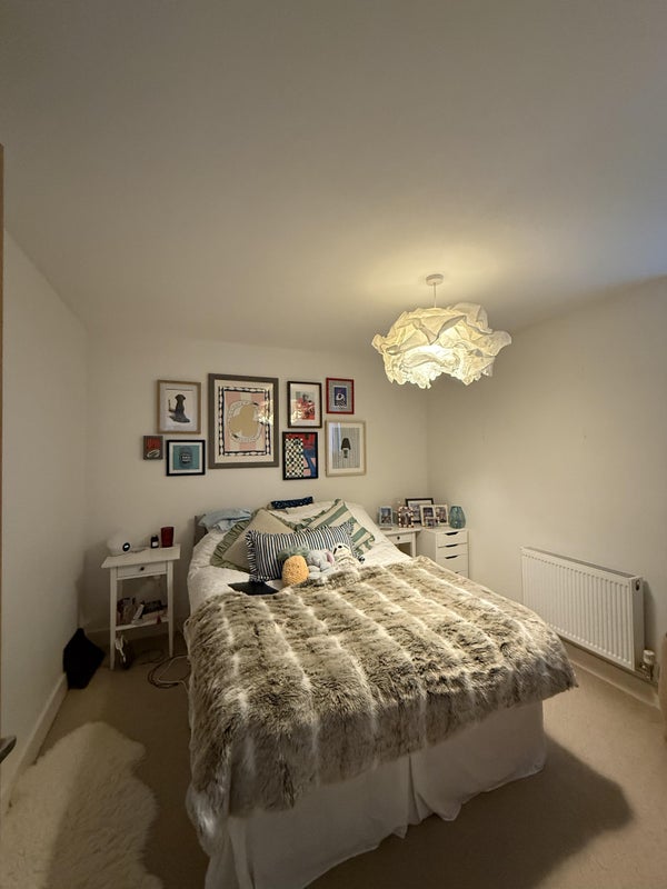 - Furnished (bed, desk, bedside tables, chest of drawers, built in wardrobe and shelves)