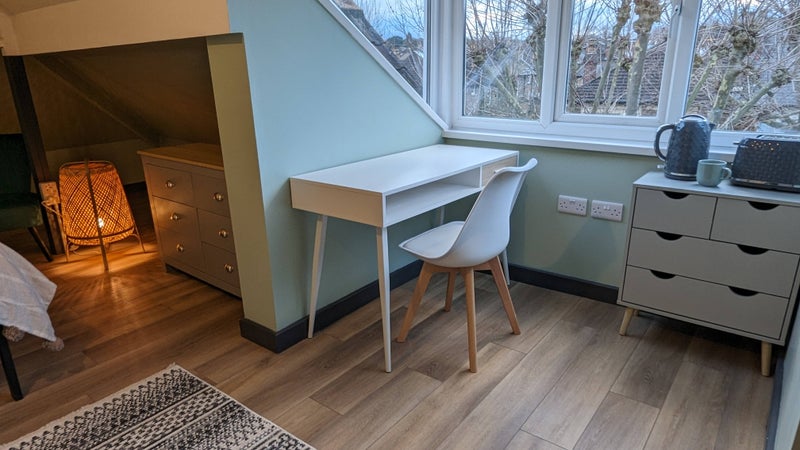Fully furnished with a comfy bed; plenty of storage; a desk and chair; and occasional chair. They also have small kitchen area with fridge including ice making compartment, toaster and kettle, as well as masses of sockets.