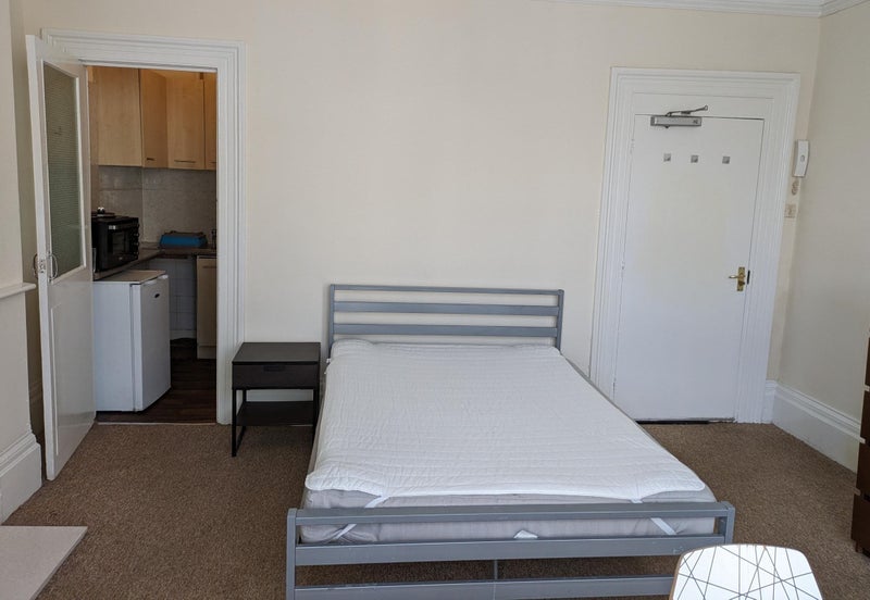 Bright studio flat with tall window and separate kitchen in a lovely period house, rent includes council tax.
