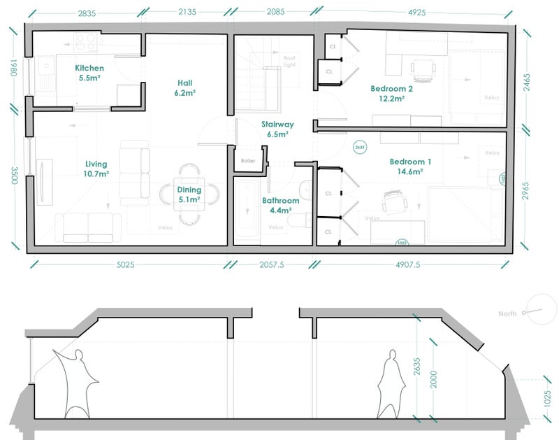 2 double rooms, 1 bathroom, shared living spaces