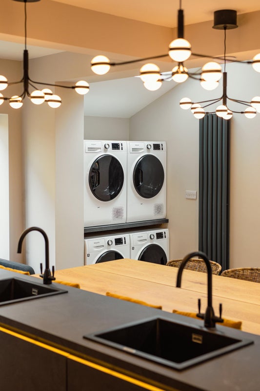 The communal area is over 30m2 making it a great place to enjoy cooking, watching the communal 4K 50” widescreen or being sociable with housemates. Including 2 induction hobs, 2 electric ovens, your own food cupboard, a shelf each in the fridges and a drawer each in the freezers. Two dishwashers and kitchen sinks along with two washing machines and two tumble dryers caters for all your washing and cleaning needs! Crockery, cutlery, pots and pans along with microwave, kettle, toaster and coffee machine all included.