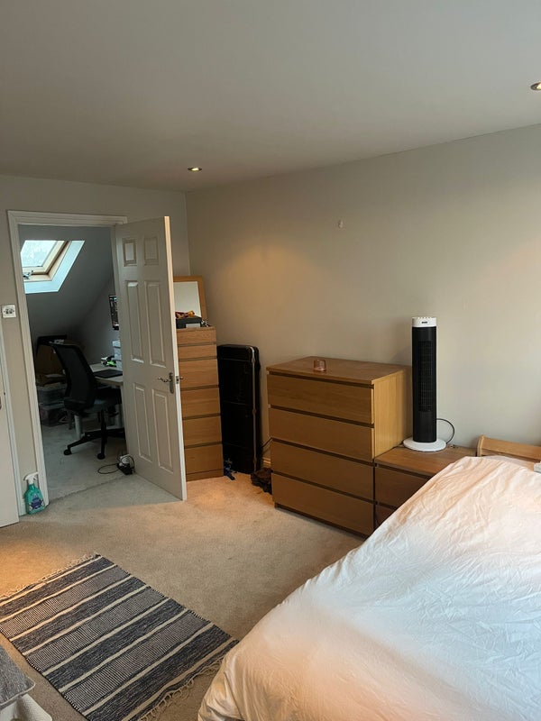 Spacious (4mx4m) & light (2 large south facing windows) double bedroom. Furnished with a double bed, large wardrobe, chest of drawers, shelves, (desk if required).