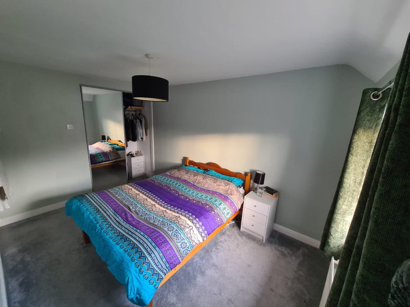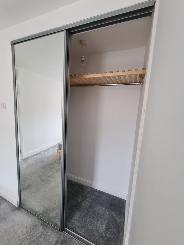 The smaller room is fully furnished with a double bed, mattress, walk-in wardrobe, bedside table, and over stairs storage.