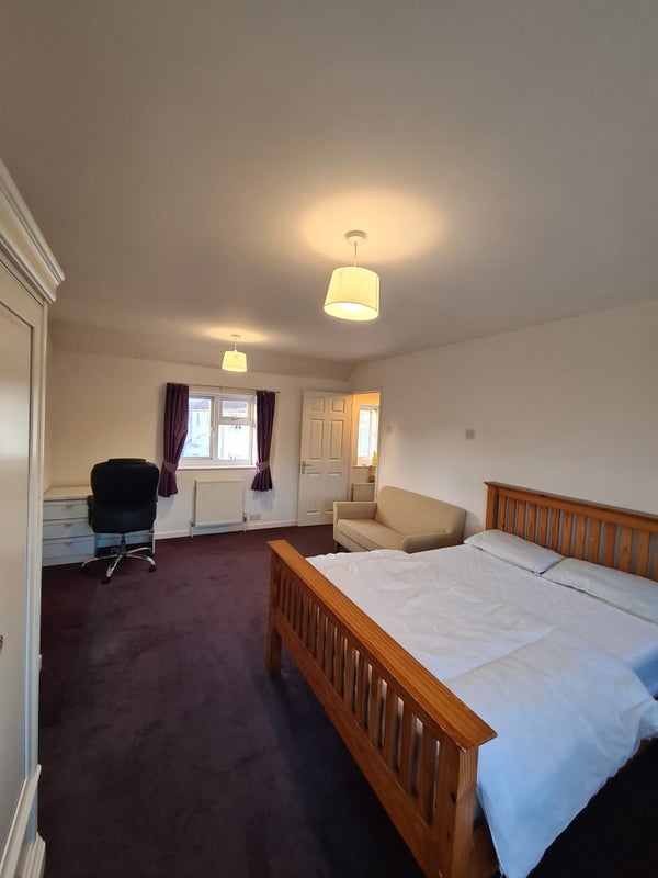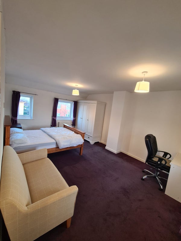 The larger room is fully furnished with a double bed, mattress, sofa, bedside table, large wardrobe, desk and desk chair.