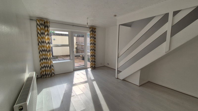 The room available is a furnished double-sized room with a single bed. The house has a small rear garden with gate access, outdoor storage, and space for bikes.
