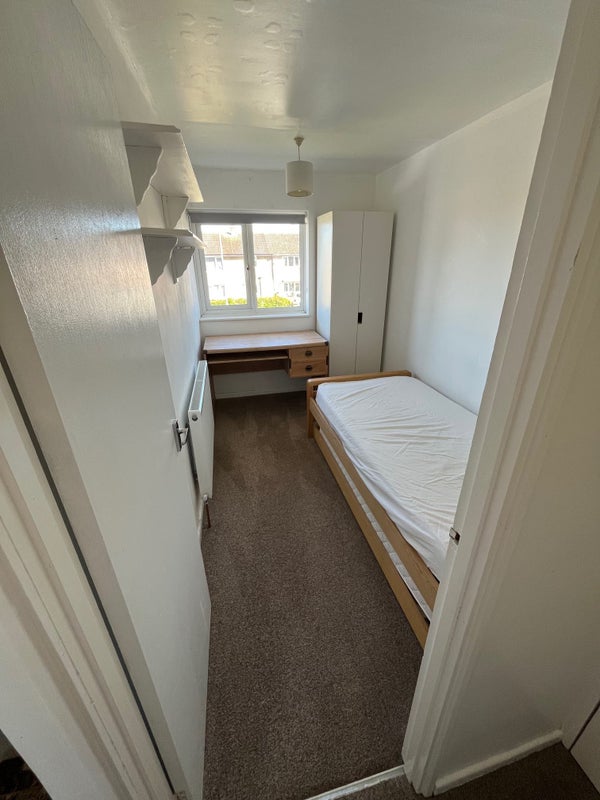 - The room has a single bed, desk and cupboard and two shelves.