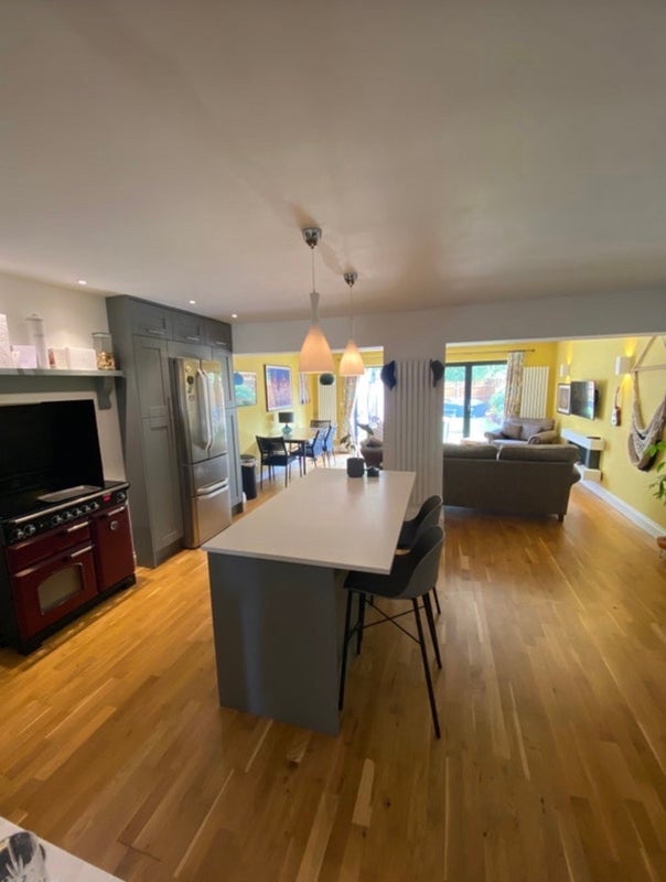 -Open plan kitchen & living room with Rangemaster induction cooker, American style fridge freezer