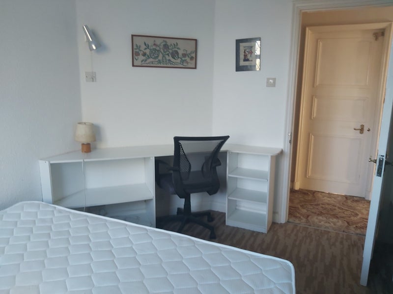 Double room with desk and lots of storage, adjacent bathroom, separate kitchen and second bathroom, dining area and office overlooking large garden in private house.
