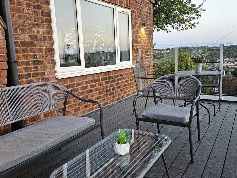 Balcony with patio furniture which extends the entire length of the house with stunning views!!