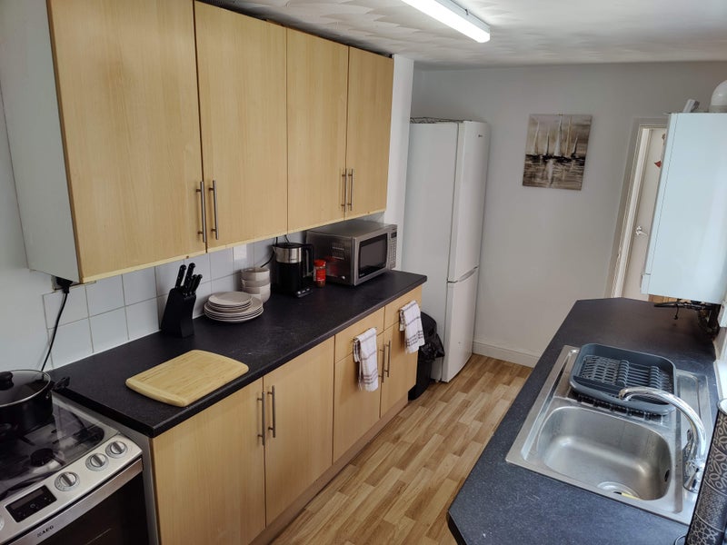 Shared kitchen is equipped with large fridge/freezer, washing machine, gas cooker, microwave & kettle. The bathroom is equipped with bath. There is a back garden available as well.