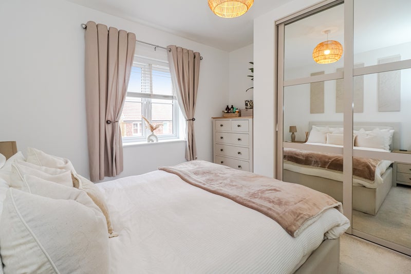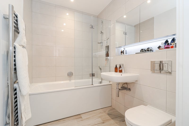 The kitchen features luxury laminate worktops and high-spec Bosch integrated appliances. The bedroom is generously sized, designed for both comfort and style, alongside a contemporary bathroom with premium fixtures and a mirrored vanity unit.
