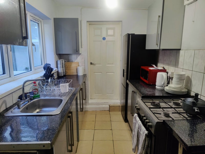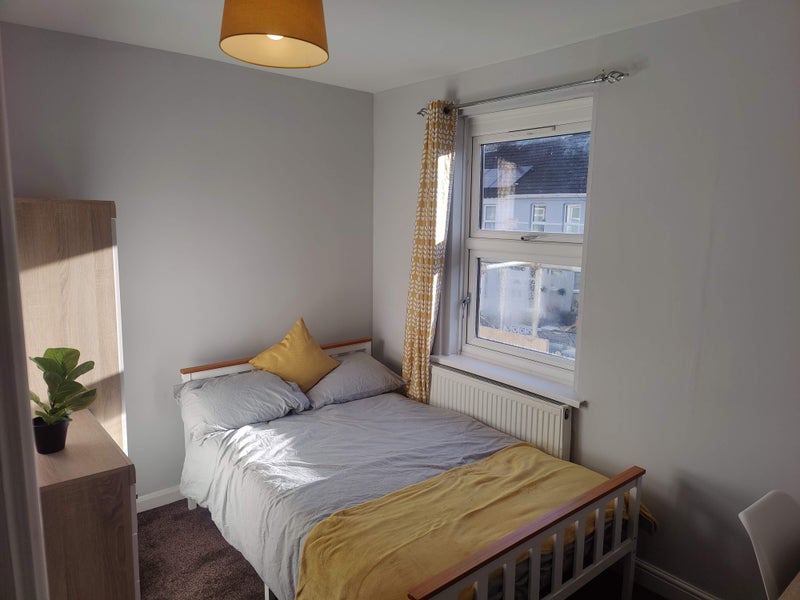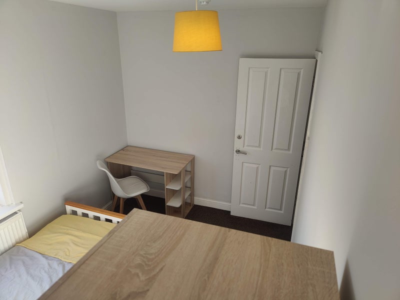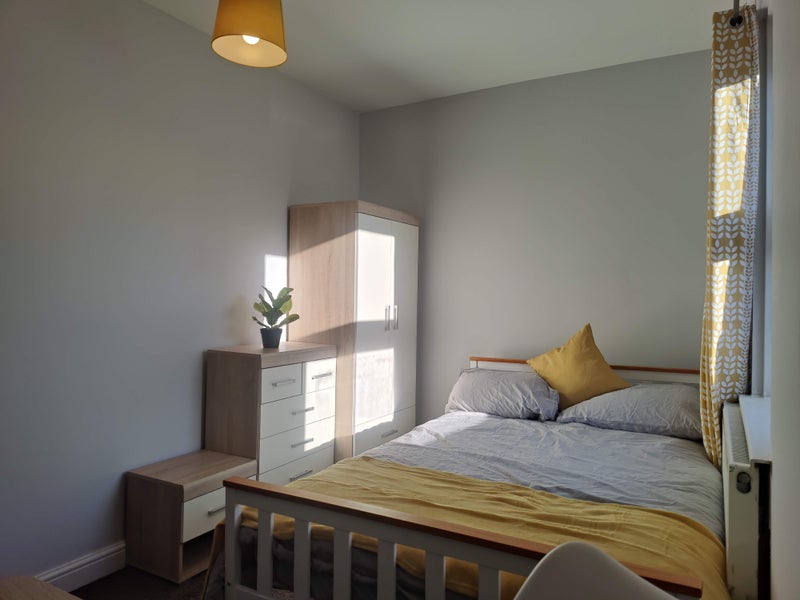 The room is fully furnished: double bed, wardrobe, chest of drawers, bedside cabinet, desk and chair. Shared kitchen is equipped with two fridge/freezers, hob and oven, microwave & kettle. There are two bathrooms available in the house, one featuring washing machine and tumble dryer. Outside there is a garden area.