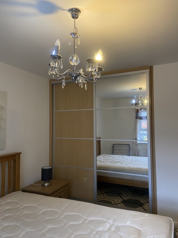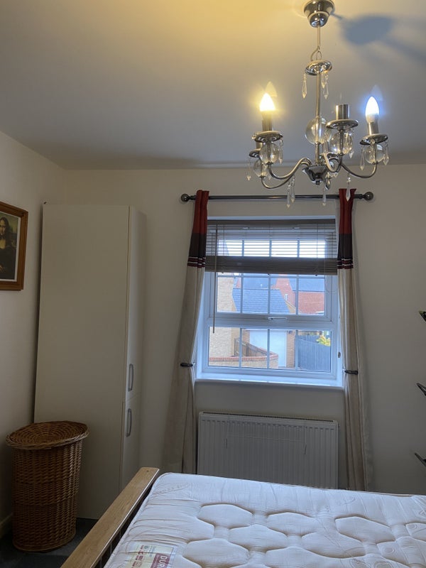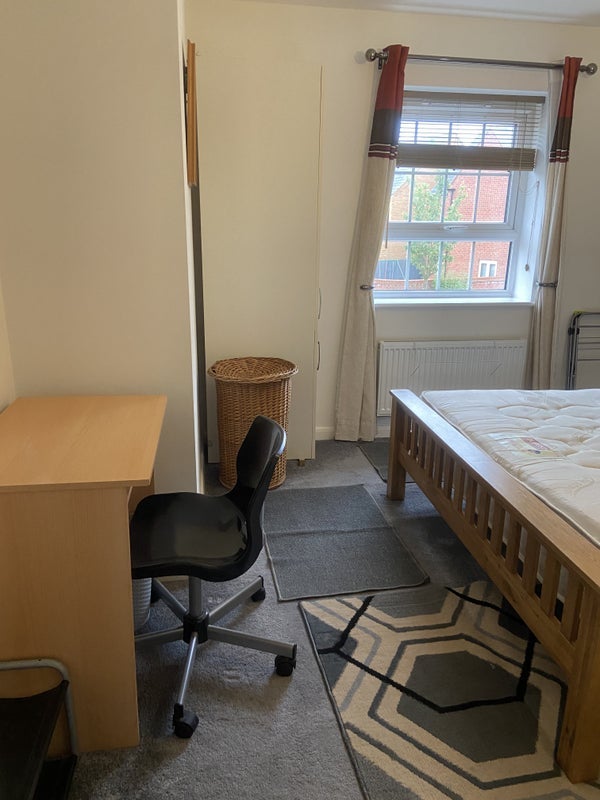The room is furnished with King Size bed , side table and lamp, In built wardrobe, Airer, laundry basket, Table chair , Shoe Rack and shared family bathroom .