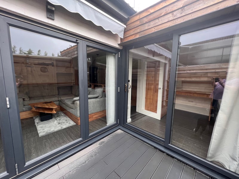 Bi-fold and sliding patio doors with black out blinds.