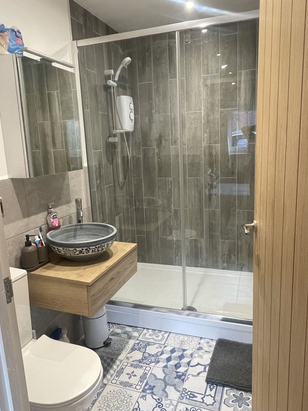 Bathroom with generous shower space, heated towel rail, WC and designer sink.
