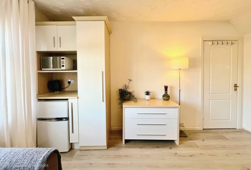 The accommodation centres around an exceptionally spacious master bedroom, designed to feel more like a living room than a typical lodger’s room. Accessed via its own secluded hallway leading to a private bathroom, the space offers a real sense of independence. The room comes fully furnished with an integrated kitchenette and desk worktop.
