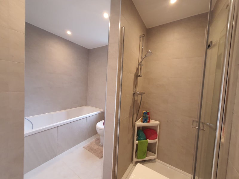 There is a modern bathroom with bath and separate double shower.