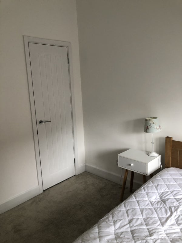 The light and airy bedroom is newly decorated, has a new double bed and mattress. High ceilings with original beams. Built in double wardrobe. Bedside table and lamp. Fold down desk / table and chair. Soft carpet. Two double sockets and electric heater. A perfect quiet room for a busy working professional.